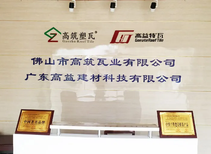 Gudangdong Gaoyi Building Material Science and Technology Co., Ltd is located in Xingjing Industrial Zone, Nanhai, Foshan City, Guangdong Province, CHINA with convenient and expedite traffic, prefect and corollary production equipment. Our company is a specialized manufacturer of Synthetic Resin Tile, ASA PVC Roof Tile, APVC Roof Tile, UPVC Roof Tile and other building materials. We got the National Utility Model Patent Certificate [Patent No.20052011714] and as a professional model tile surface material production enterprise, both absorption Europe forty years plastic tile production technology, and grasp the use of modern chemical rapid-progress of advanced technology materials and equipment. There are four companies (Gudangdong Gaoyi Building Material Science and Technology Co., Ltd, Gudangdong Gaozhu Building Material Science and Technology Co., Ltd, Foshan Gaozhu Tiles Co., Ltd, Foshan Uniko Building Materials Co., Ltd), which are one of the biggest manufacturer of Synthetic Resin Tile, ASA PVC Roof Tile, APVC Roof Tile, UPVC Roof tile and other plastic building Materials in CHINA.