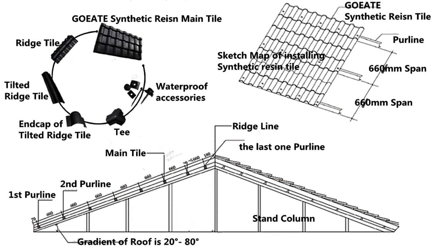 1. Purline can choose square tube (60*40*3mm) or section steel (100*50*3mm) or anticorrosive flitch (60*40mm). The space between purlines is 660mm for 2.0mm thickness synthetic resin tile, 760mm space for 2.5mm thickness, and 860mm space for 3.0mm thickness synthetic resin tile.