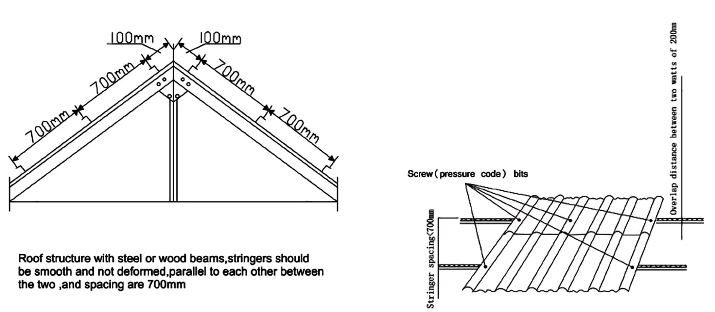 4. There are two waves in the horizontal lap joint of medium-wave/small trapezoid wave tiles. Vertical overlap>300mm.