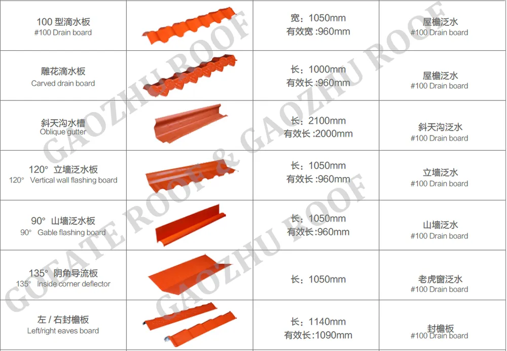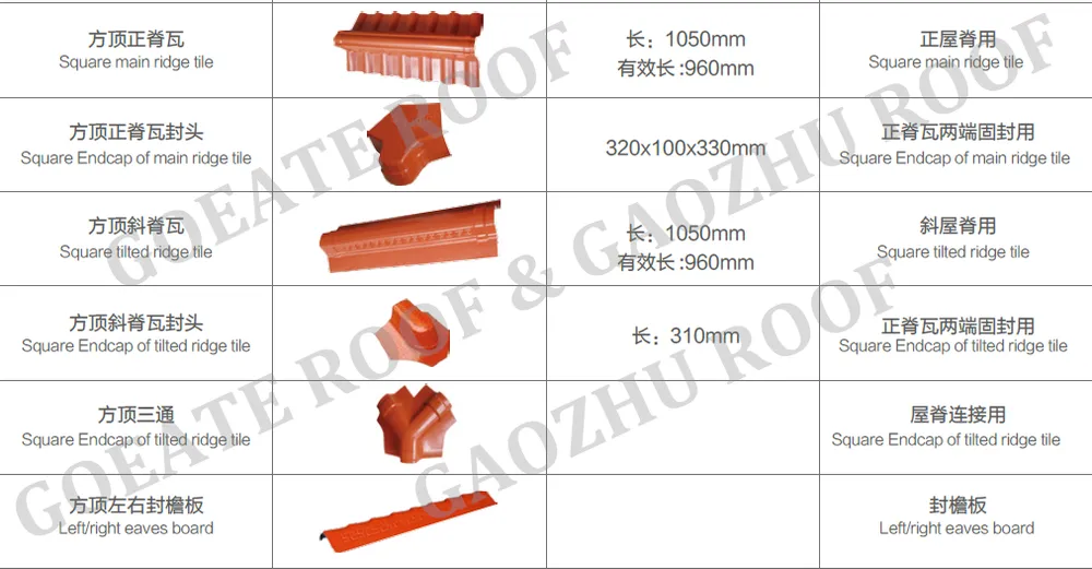 4.When installing,the joining place between the main ridge and the tilted ridge tile should be sawed to be even.install the main ridge tile and the tilted ridge tile before installing the 3-tee.the fixed parts are special fittings.