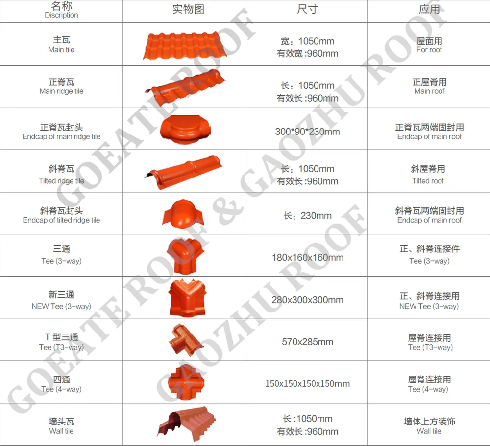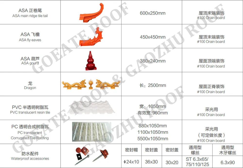 Goeate/Gaozhu Synthetic resin tile, Classical resin tile, Chinese-style resin tile, using ASA high weather resistant engineering plastic (ASA high weather resistant engineering plastic of SABIC,one of the world's top 500 Enterprises) and PVC (polyvinyl chloride resin) as main material, mixing anti-UV agent, shielding agent, antioxidant, modifier and other super weathering chemical ingredients.